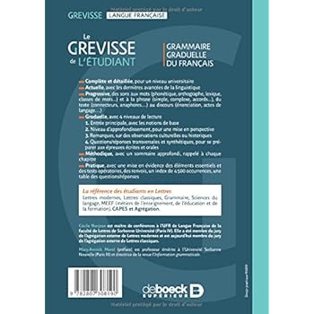 Grammaire du français d'aujourd'hui, claire, pratique, concrète, systématique, intégrant les acquis de la linguistique moderne. Pour les étudiants en lettres modernes (CAPES et agrégation). Grammaire graduelle du français Complète et détaillée, pour un niveau universitaire Actuelle, avec les dernières avancées de la linguistique Progressive, des sons aux mots (phonétique, orthographe, lexique, classes de mots...) et à la phrase (simple, complexe, accords...), du texte (connecteurs, anaphores...) au discours (énonciation, actes de langage...) Graduelle, avec 4 niveaux de lecture1. Entrée principale, avec les notions de base2. Niveau d approfondissement, pour une mise en perspective3. Remarques, sur des observations culturelles ou historiques4. Questions/réponses transversales et synthétiques, pour se préparer aux épreuves écrites et orales Méthodique, avec un sommaire approfondi, rappelé à chaque chapitre Pratique, avec une mise en évidence des éléments essentiels et des tests opératoires, des renvois, un index de 4 500 occurrences, une table des questions/réponsesLa référence des étudiants en LettresLettres modernes, Lettres classiques, Grammaire, Sciences du langage, MEEF (métiers de l enseignement, de l éducation et de la formation). CAPES et Agrégation.